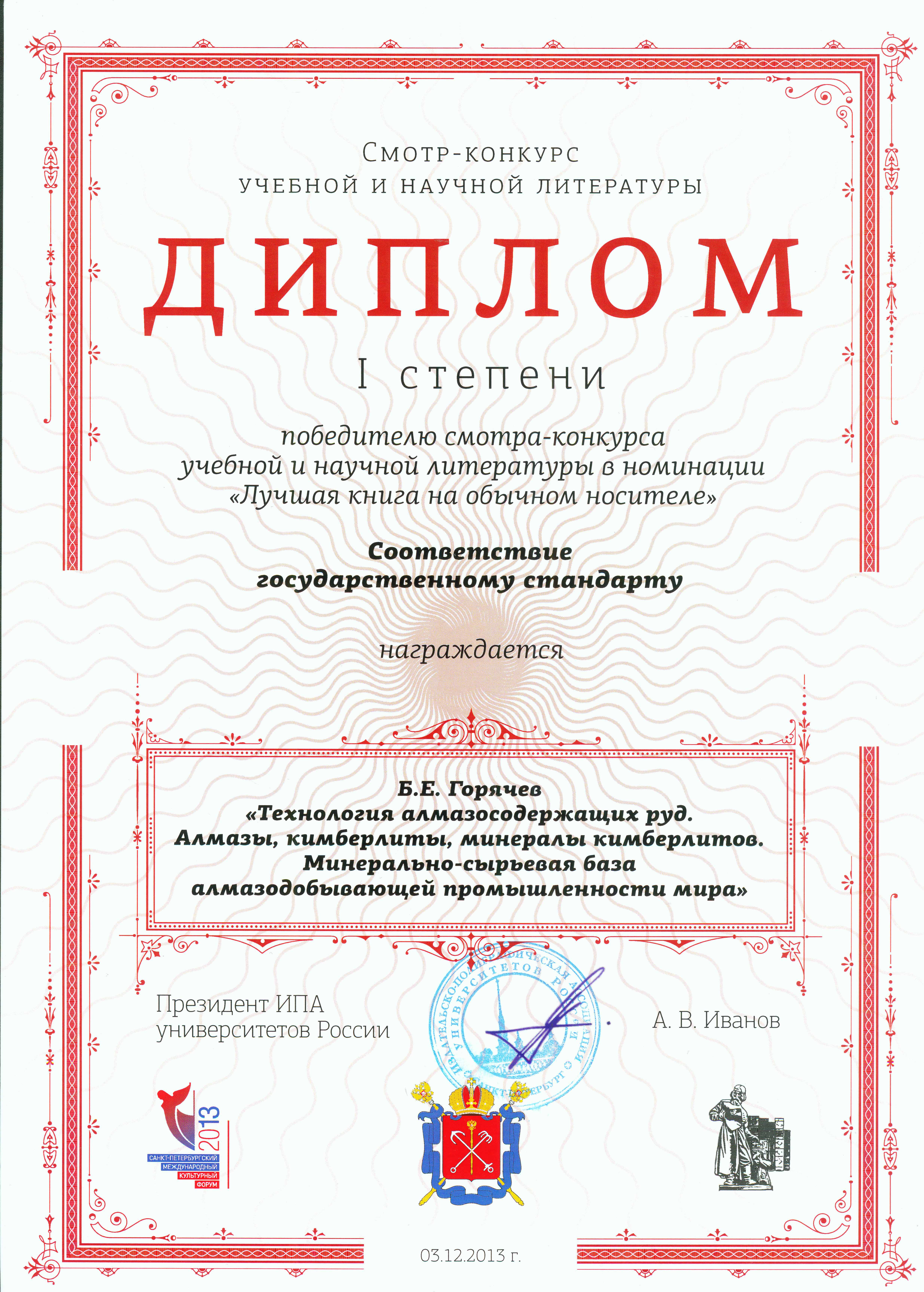 Б. Е. Горячев «Технология алмазосодержащих руд. Алмазы, кимберлиты, минералы кимберлитов. Минерально-сырьевая база алмазодобывающей промышленности мира» — диплом I степени за победу в номинации «Лучшая книга на обычном носителе» за соответствие государственному стандарту;