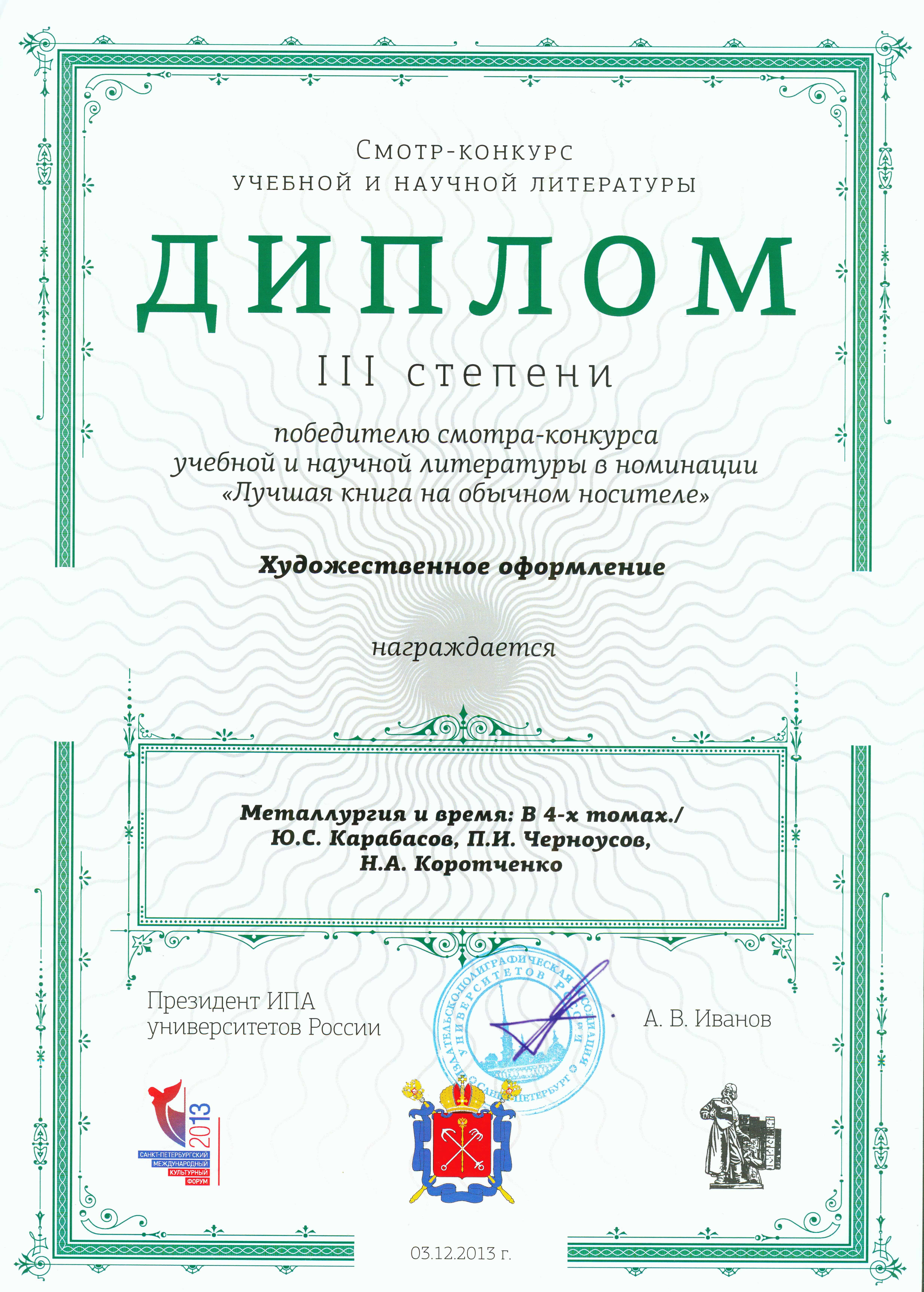 2-4 декабря состоялся II Санкт-Петербургский международный культурный форум. На смотре-конкурсе учебной и научной литературы НИТУ «МИСиС» был награжден почетной грамотой «За большой вклад в обеспечение образовательного процесса в вузе учебной и научной литературой». Издания, выпущенные ИД НИТУ «МИСиС», отмечены дипломами I и II степени за победу в номинации «Лучшая книга на обычном носителе» за соответствие государственному стандарту и диплом III степени за художественное оформление.