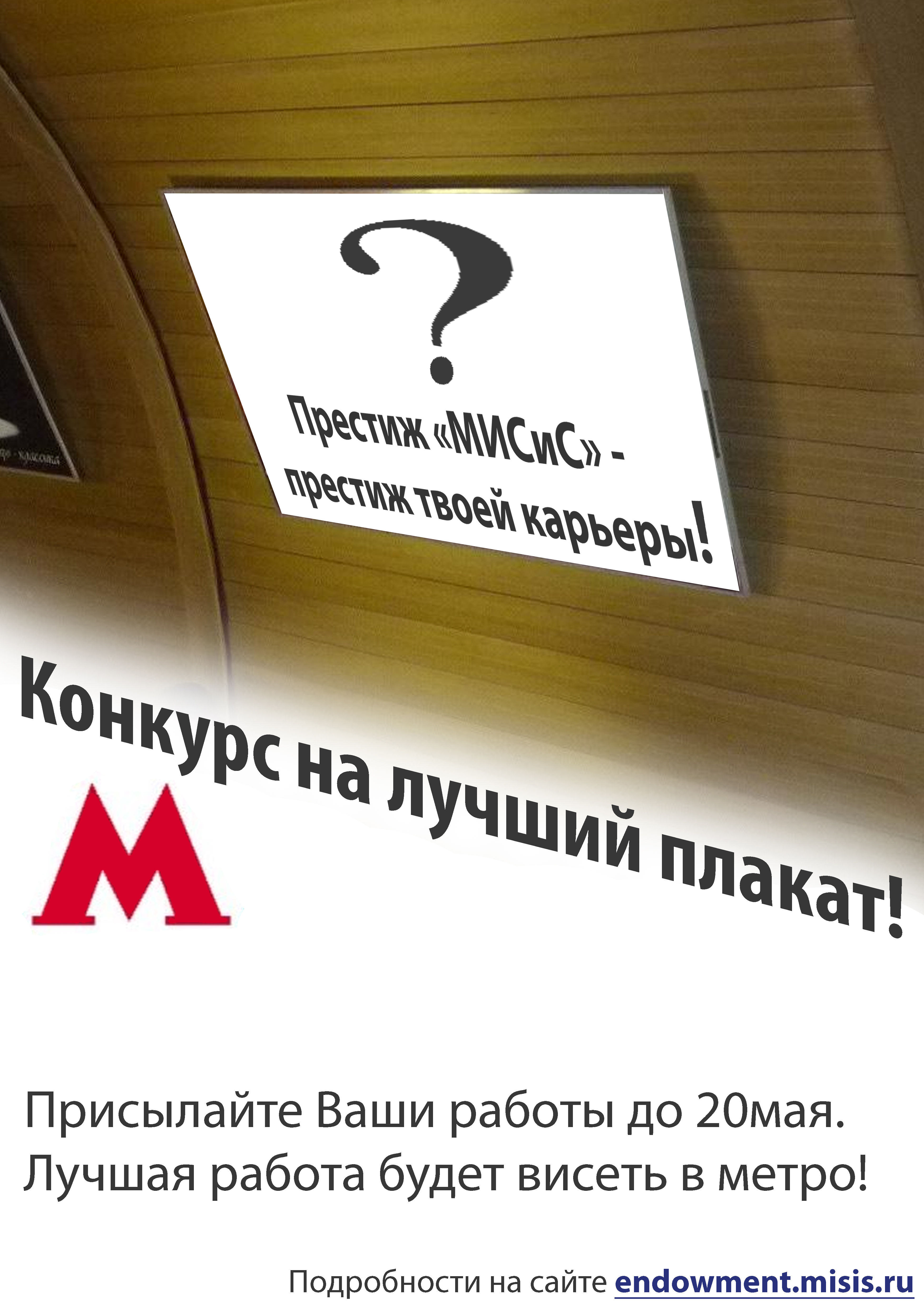 Участникам конкурса предлагается создать плакат с лозунгом «Престиж „МИСиС“ — престиж твоей карьеры!» Лучший плакат будет висеть на стенде в метро «Октябрьская» (кольцевая линия).