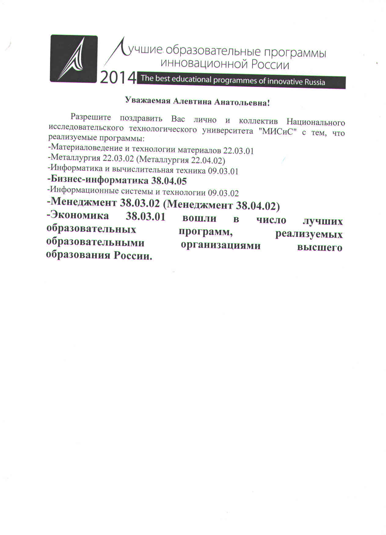 В рамках всероссийского проекта 2014 года «Лучшие образовательные программы инновационной России», в числе лучших образовательных программам, реализуемых образовательными организациями высшего образования России были отобраны программы института экономики и управления промышленными предприятиями (ЭУПП) НИТУ МИСиС.