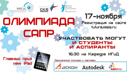 Уже завтра в МИСиС пройдет олимпиада по инженерной графике и компьютерному моделированию. Приз за первое место — iPad New 32 Gb. Спешите зарегистрироваться!