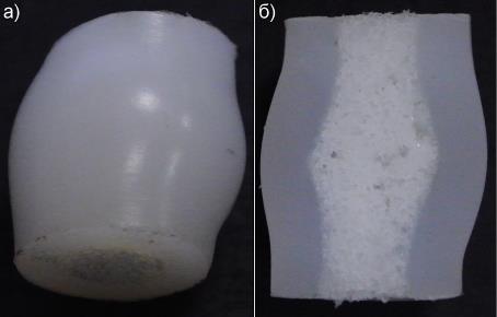 - Проведено изготовление экспериментальных образцов биоинженерных конструкций на основе пористого СВМПЭ. Формируемые биоинженерные конструкции имитируют трубчатую кость. Пористый слой СВМПЭ имитирует губчатую ткань, а сплошной армирующий слой СВМПЭ кортикальную.