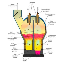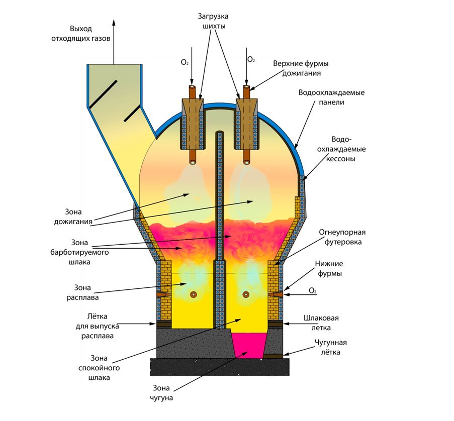 80-х годах технологию Ромелт, и разделили реактор на две зоны: плавильную и восстановительную. Расчеты показывали, что при такой конфигурации печи можно снизить расход угля и кислорода на 1 т получаемого чугуна на 20 — 30 %. Шлаковая ванна и ванна железистого расплава продуваются струей газа с содержанием кислорода50–99%. Поддерживается температура на уровне1400–1500 оС. На поверхность ванны расплава подаются железосодержащие материалы, энергетический уголь, флюсующие добавки. Уголь, попадающий на поверхность расплава, вовлекается шлаковыми потоками в нижние зоны ванны, где за счет кислородного потока, происходит его горение до углекислого газа и паров воды. Далее расплав перетекает в восстановительную зону, где происходит его окончательное восстановление до чугуна. Ряд цветных металлов также восстанавливается до металла, и удаляются с отходящими газами из печи. Далее они улавливаются в пыли, и образуют еще один товарный продукт — концентрат цветных металлов».