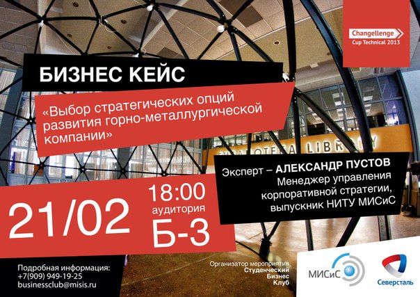 Первым в нашем университете будет проведен кейс на тему «Выбор стратегических опций развития горно-металлургической компании» от небезызвестной нам компании «Северсталь». Приглашенный эксперт Александр Пустов, менеджер управления корпоративной стратегии, выпускник НИТУ «МИСиС», расскажет обо всех тонкостях ведения и решения кейсов. Кроме того, специалист поведает о чемпионате, проводимом компанией Changelenge по всей России.