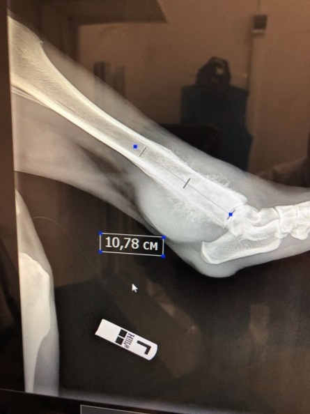 Рис. 1 — Рентгеновский снимок задней конечности животного до операции. Остеосаркомой поражено почти 11 см костной ткани.