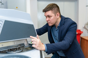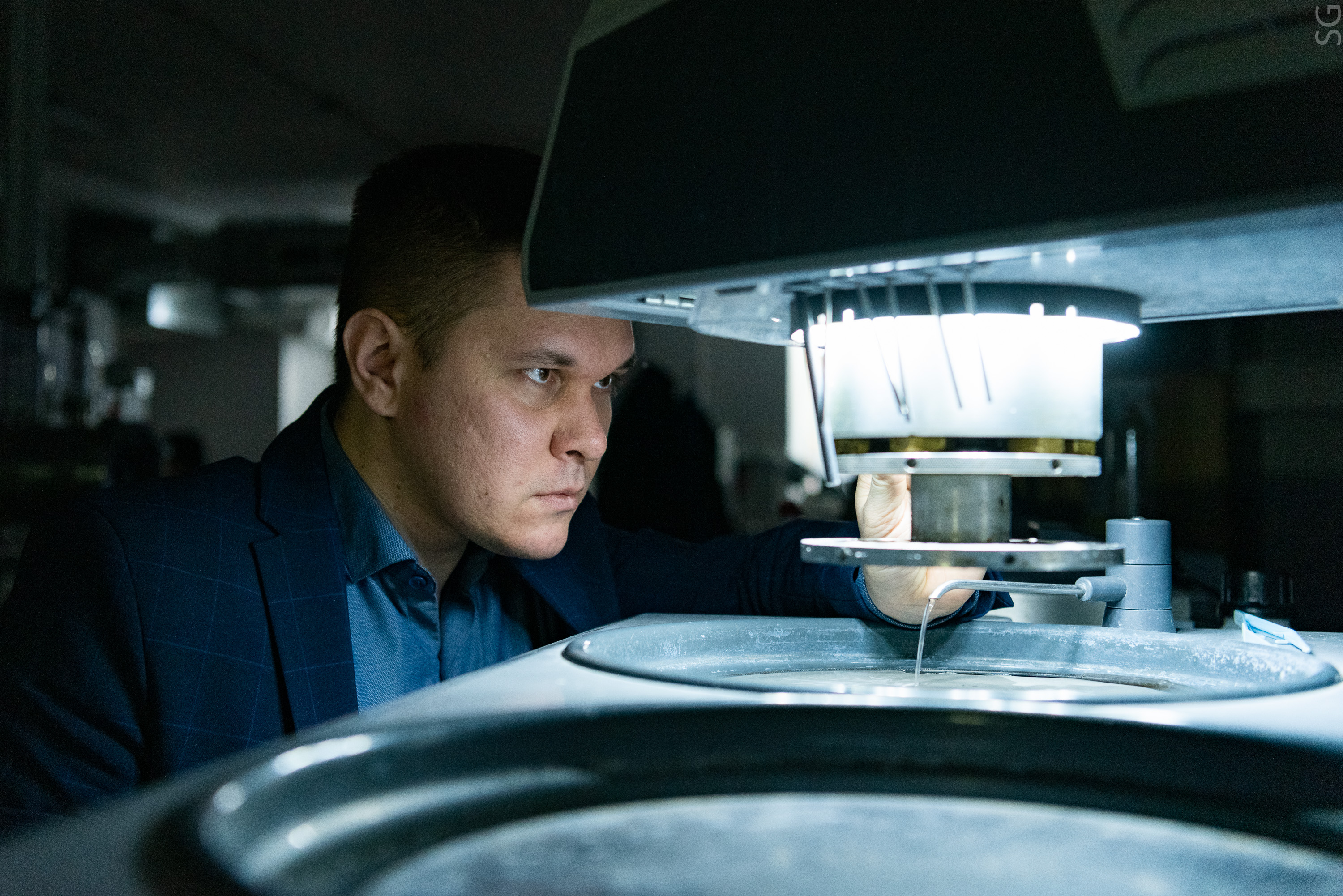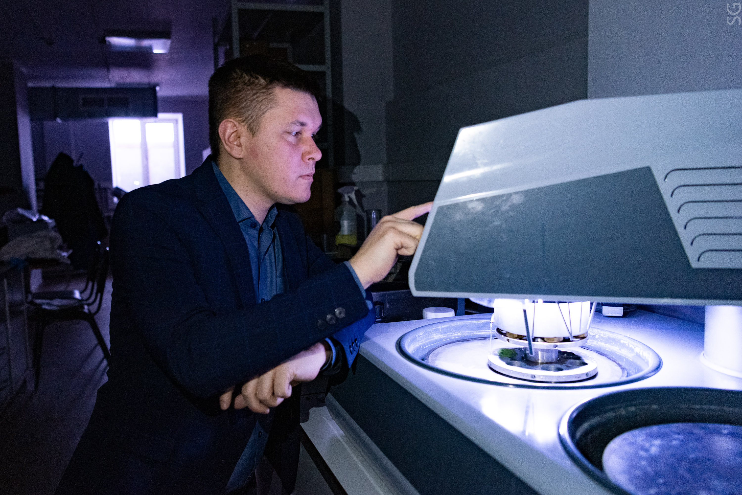 Дмитрий Московских, директор НИЦ «Конструкционные керамические наноматериалы» стоит в лаборатории около оборудованияДмитрий Московских, директор НИЦ «Конструкционные керамические наноматериалы» стоит в лаборатории около оборудования