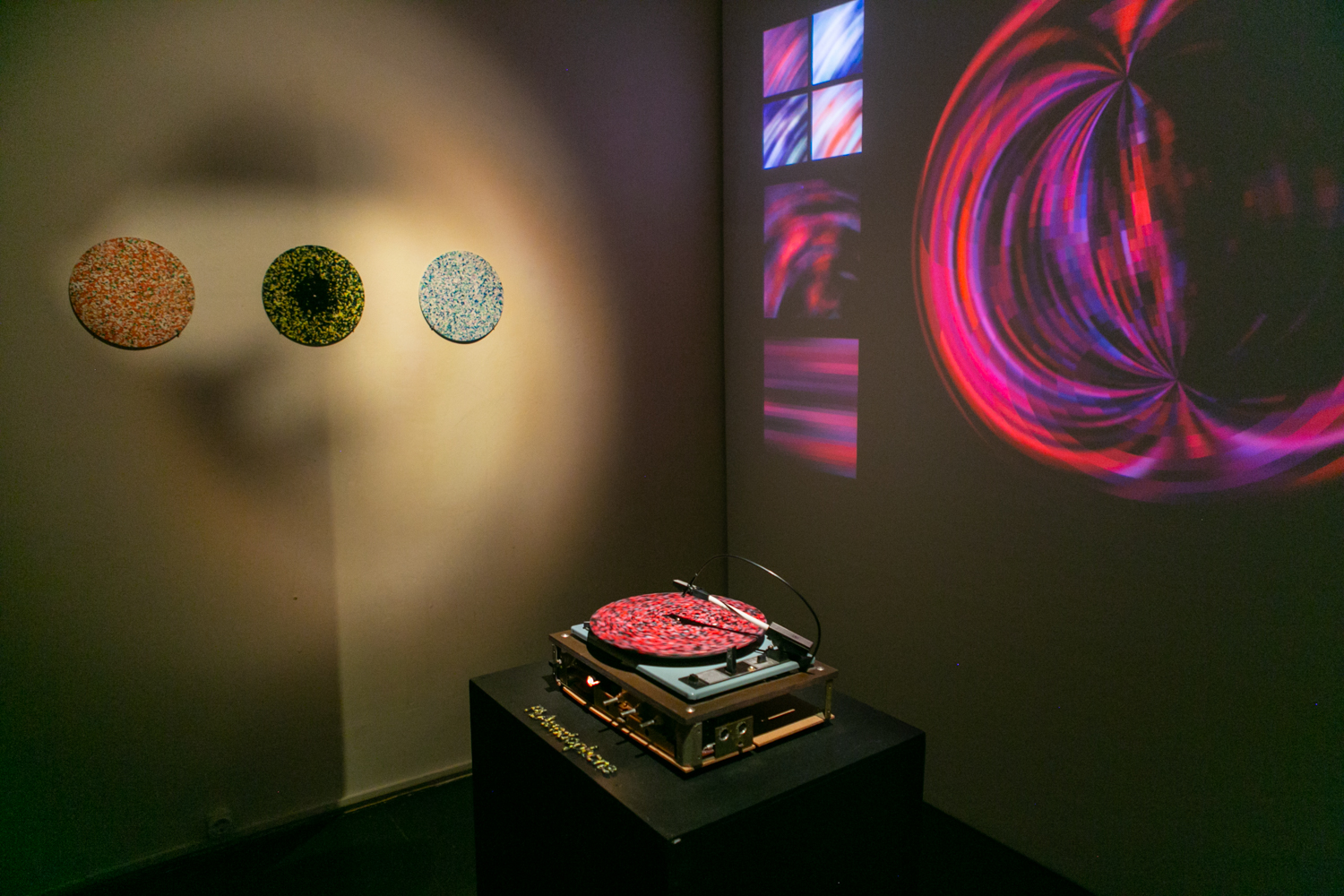 Звуковая инсталляция Надежды Крохиной и Григория Цветкова «PLAundophone» направлена на переосмысление классического проигрывателя виниловых дисков. Пластинка из измельченного вторичного пластика с цветовым узором находится в непрерывном движении, и зритель слышит звук, в который с помощью программного обеспечения и видеокамеры в реальном времени преобразуется изображение.
