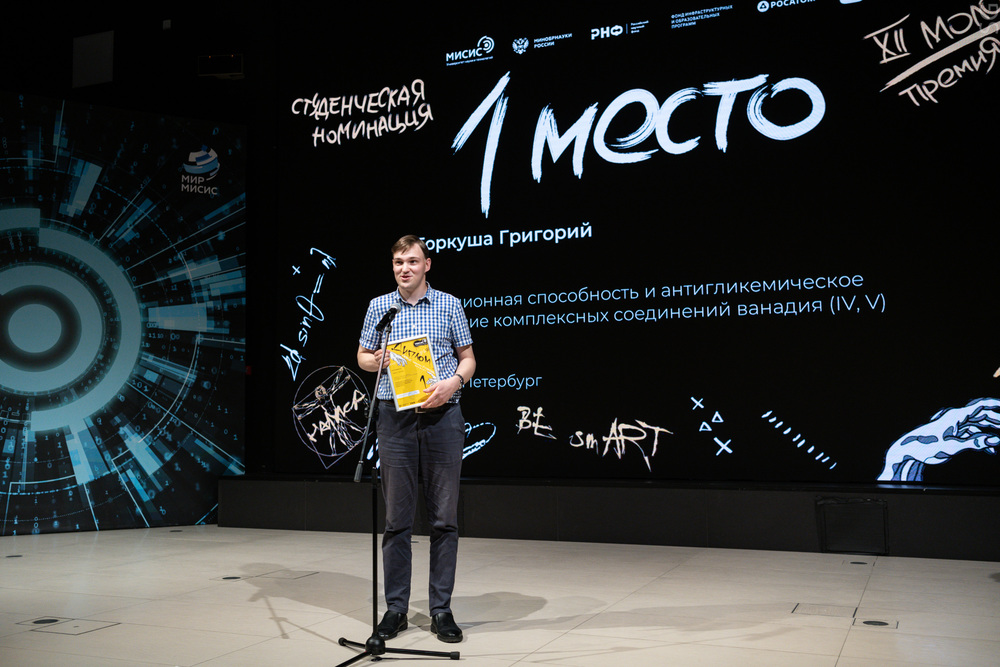 Победителем в студенческой номинации стал студент 3 курса СПбГТИ(ТУ) Григорий Гаркуша. В его работе представлены исследования взаимодействий биядерного цитратного комплекса ванадия с различными группами углеводов в организме.