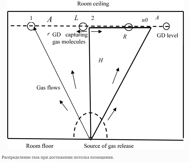 Математический метод расчета рационального размещения газовых детекторов для помещений на потенциально опасном производстве предложил Андрей Петров, д.т.н., профессор кафедры автоматизированного проектирования и дизайна НИТУ МИСИС, совместно с коллегами из Академии ГПС МЧС России, ГГНТУ и МАДИ. Предполагается, что наиболее вероятные источники возгорания находятся в зоне пола, где существует риск пожара или взрыва. Опасные газы распространяются вверх и в стороны, поэтому газовые детекторы должны располагаться в верхней части помещения таким образом, чтобы гарантировать регистрацию небольших концентраций монооксида углерода (CO) и водорода (H2) до того, как концентрация выделяемого газа достигнет опасного значения. Согласно математической модели, разработанной учеными, газ достигает потолка на высоте 6 м через 220 с после начала выброса.