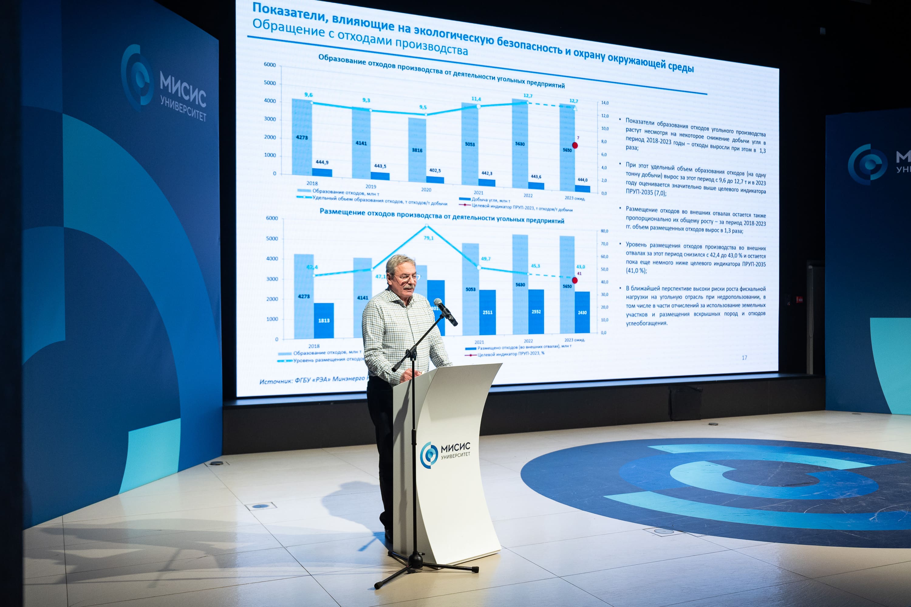 Директор Горного института НИТУ МИСИС Александр Мясков рассказал о направлениях работы в вузе по экологической тематике: рециклинг промышленных отходов, ресурсосбережение, декарбонизация и низкоуглеродная экономика. По словам спикера, за последний год в рамках стратегического проекта НИТУ МИСИС «Технологии устойчивого развития» по программе Минобрнауки России «Приоритет 2030» в университете разработаны несколько ноу-хау, среди которых методика оценки долговременного воздействия отходов на окружающую среду и анализ эффективности пылеподавления с использованием химических реагентов.