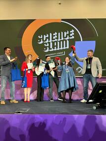На слэме ученые рассказывают о собственных исследованиях, у каждого есть только 10 минут, чтобы сделать это увлекательно и понятно, а затем они отвечают на три вопроса из зала.