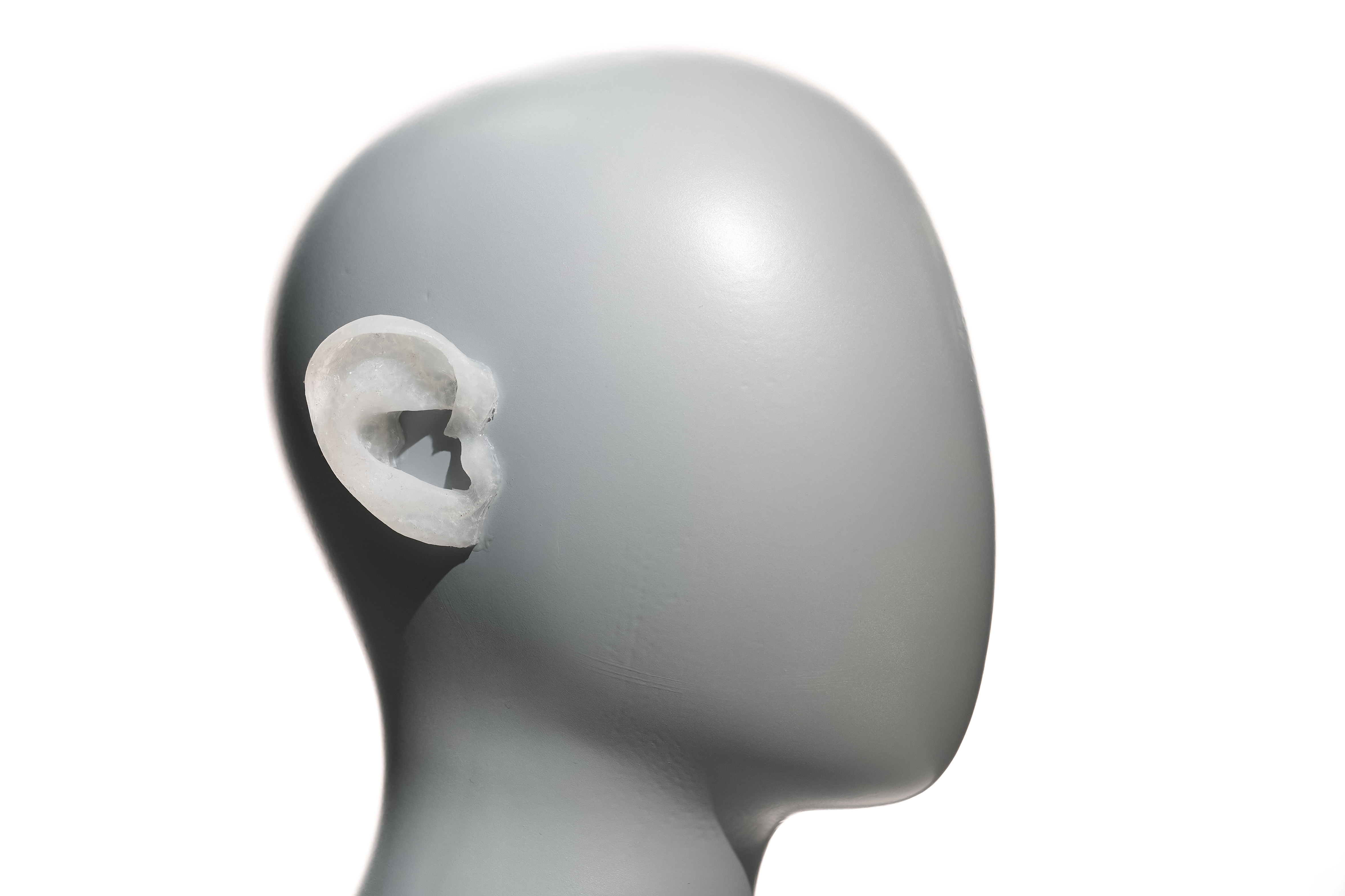 По полученной 3D модели в стерильных условия печатается гибридный полимерный каркас ушной раковины.