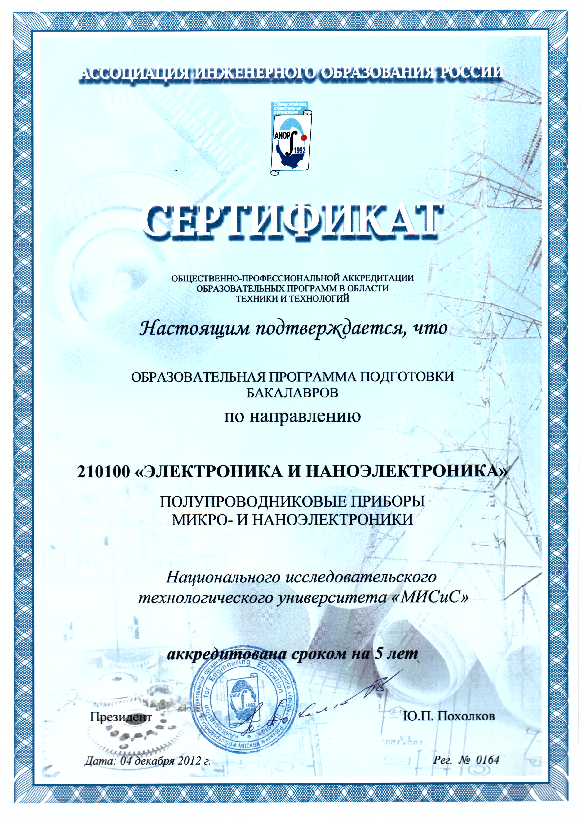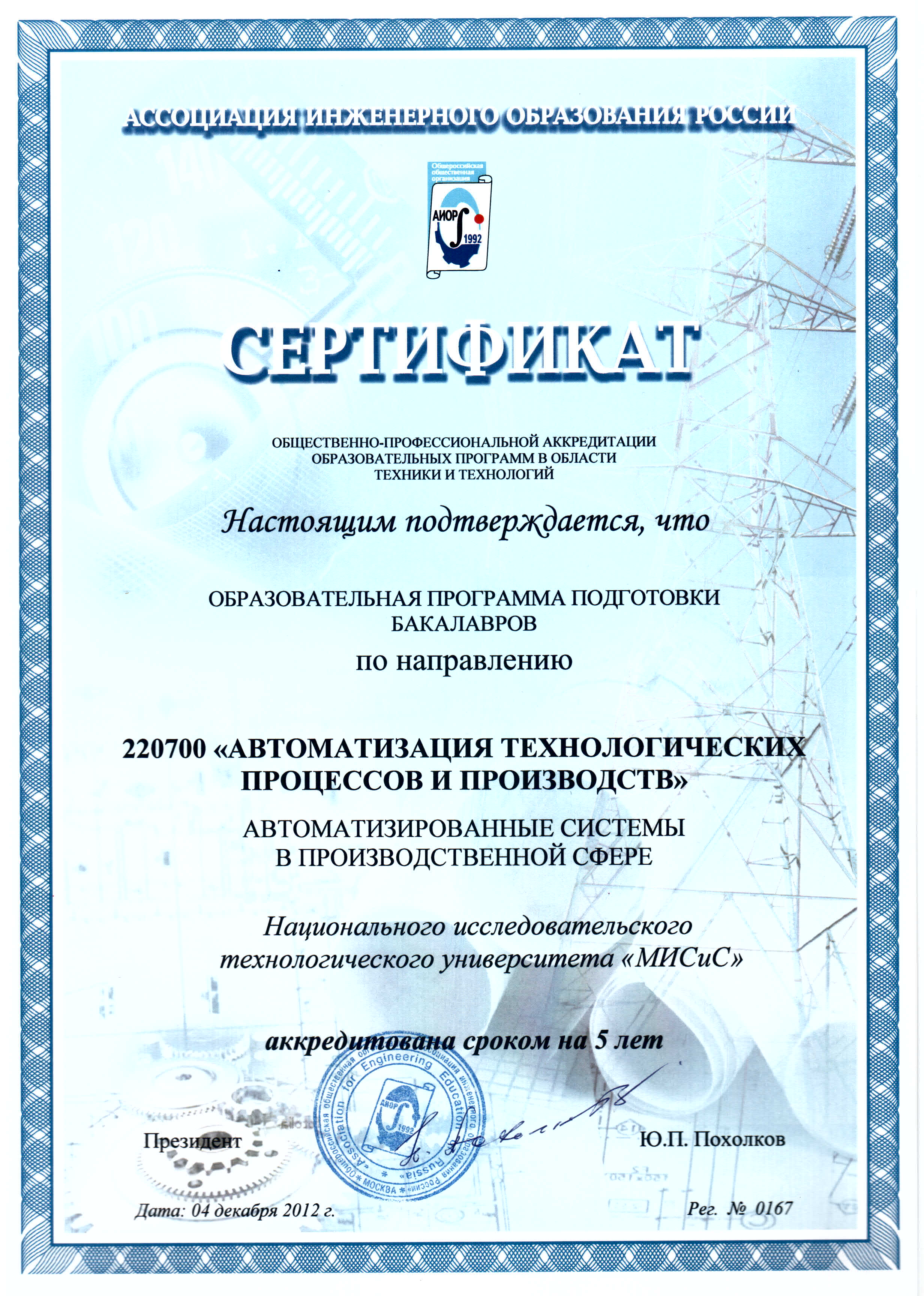- Сертификат АИОР о прохождении общественно-профессиональной аккредитации образовательных программ в области техники и технологий от 04.12.2012 г. рег. № 0162