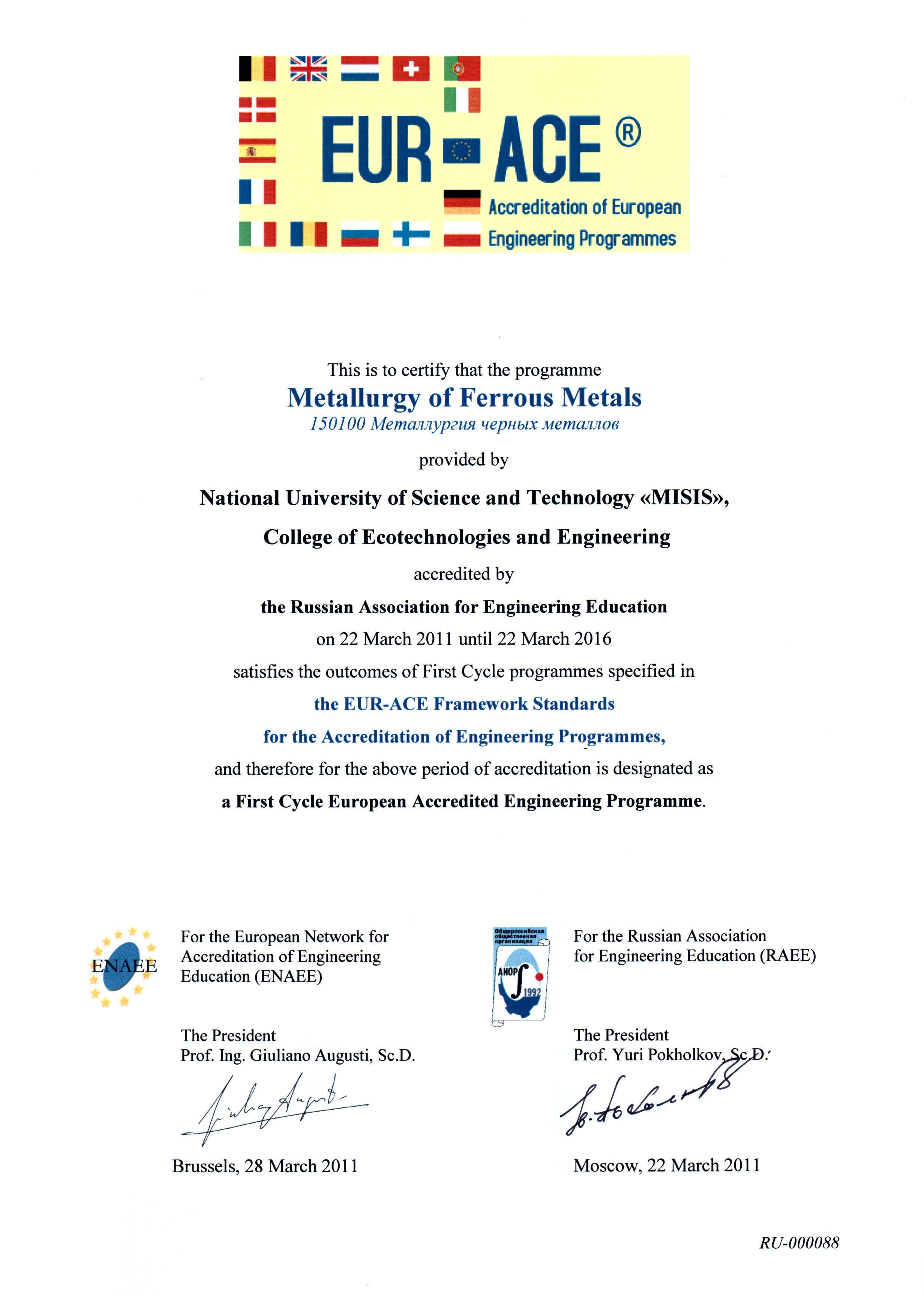 - Сертификат Европейской сети по аккредитации в области инженерного образования (ENAEE) о присвоении «Европейского знака качества» (EUR-ACE® label) от 22.03.2011 г. № RU-000088