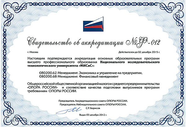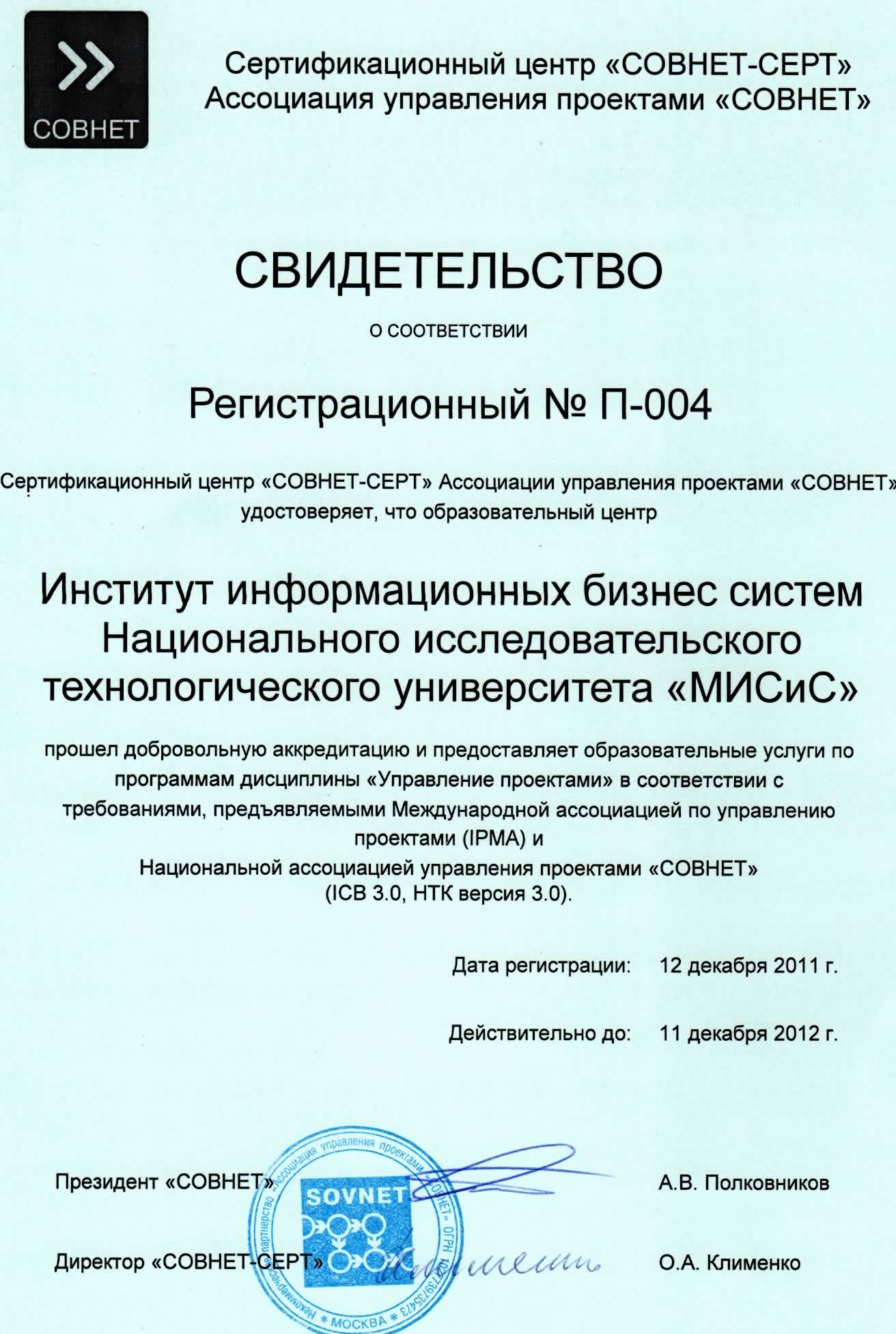 - Свидетельство о соответствии программы дисциплины «Управление проектами» требованиям, предъявляемым Международной ассоциацией по управлению проектами (IPMA) и Национальной ассоциацией управления проектами «СОВНЕТ» (ICB.3.0, HTK версия 3.0) (рег. номер № П-004 от 12.12.2011)