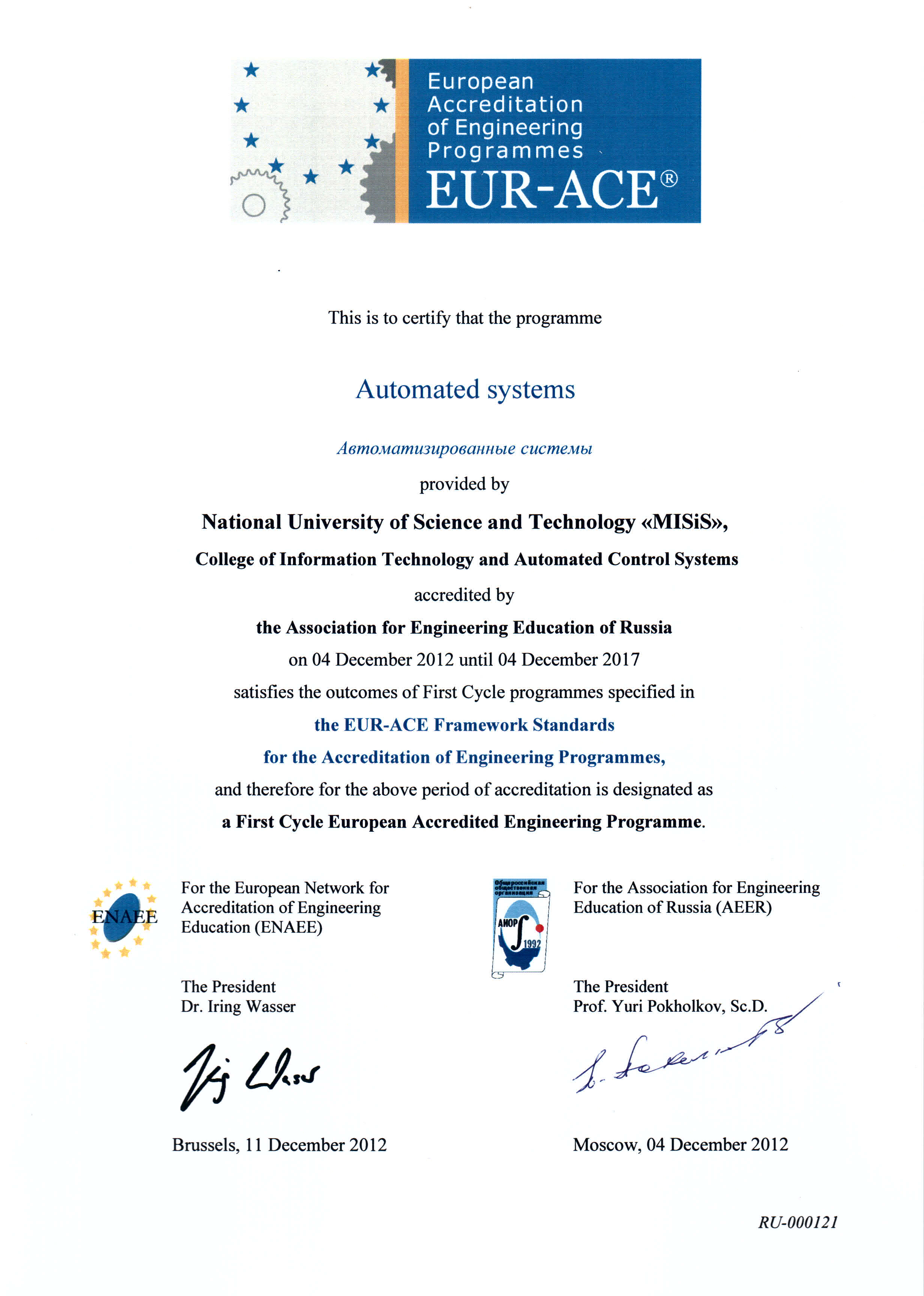 - Сертификат Европейской сети по аккредитации в области инженерного образования (ENAEE) о присвоении «Европейского знака качества» (EUR-ACE® label) от 04.12.2012 г. № RU-000121