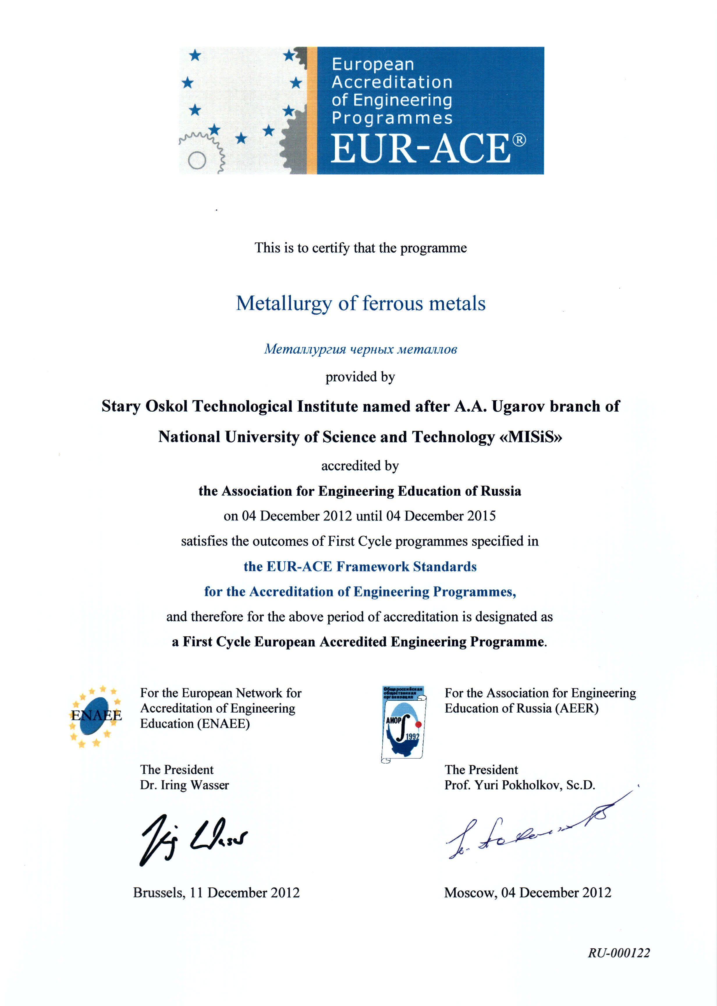 - Сертификат Европейской сети по аккредитации в области инженерного образования (ENAEE) о присвоении «Европейского знака качества» (EUR-ACE® label) от 04.12.2012 г. № RU-000122