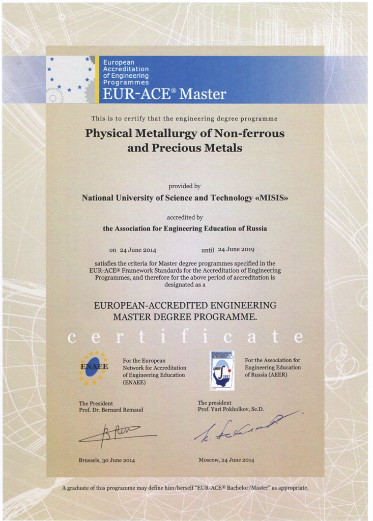 - Сертификат Европейской сети по аккредитации в области инженерного образования (ENAEE) о присвоении «Европейского знака качества» (EUR-ACE® Master) от 24.06.2014 г.
