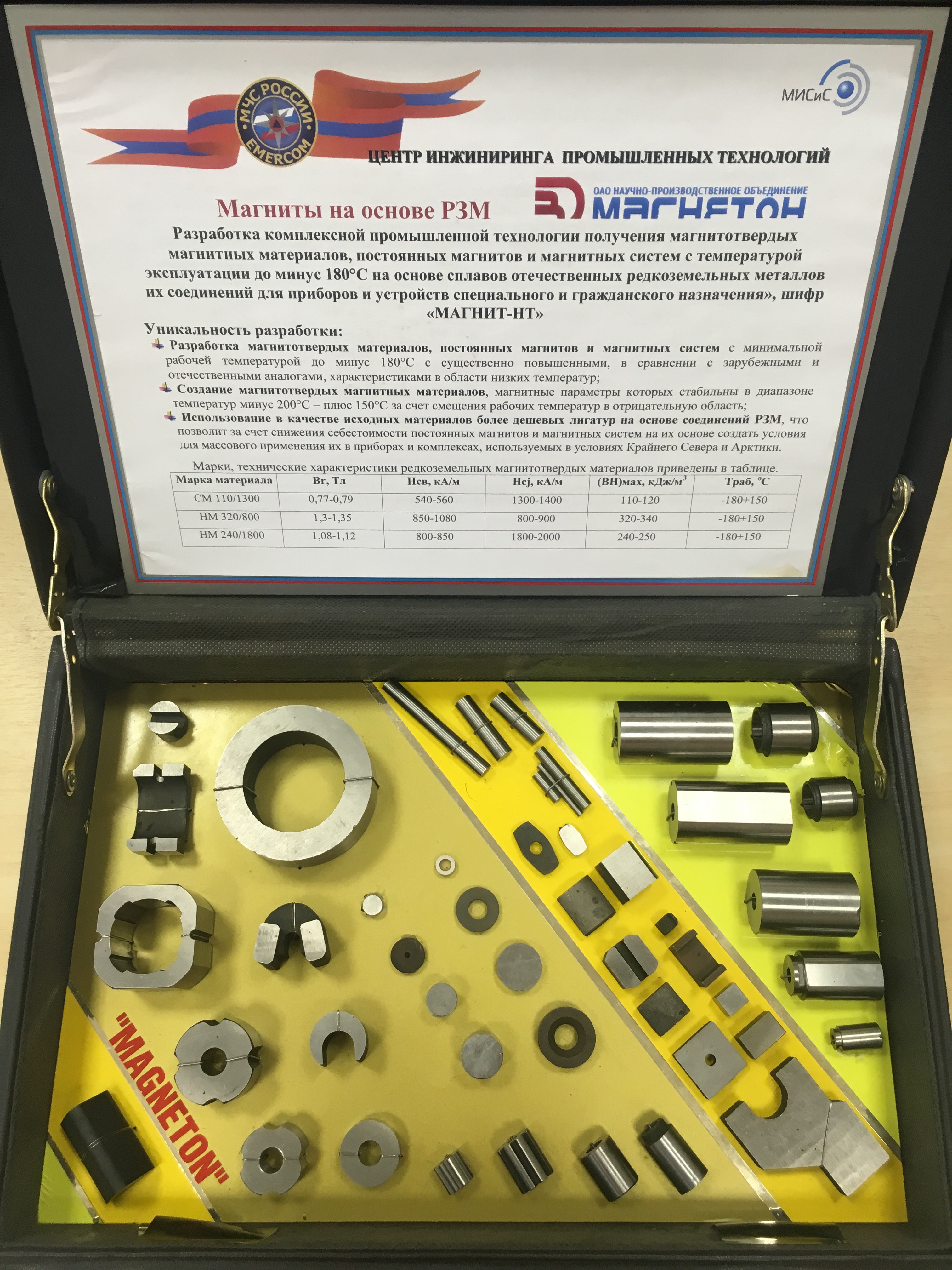 - разработка магнитотвердых материалов, постоянных магнитов и магнитных систем с минимальной рабочей температурой до минус 180°C с существенно повышенными, в сравнении с зарубежными и отечественными аналогами, характеристиками в области низких температур;