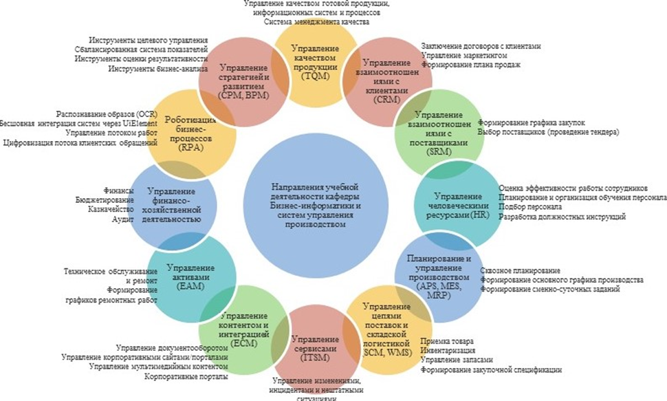 Студенты кафедры получают профессиональную подготовку в проектировании информационных систем в различных предметных областях: управление производством, управление бюджетированием, управление закупками, управление человеческими ресурсами, управление сбытом, управление активами, управление цепочками поставок, управление финансами и другие.