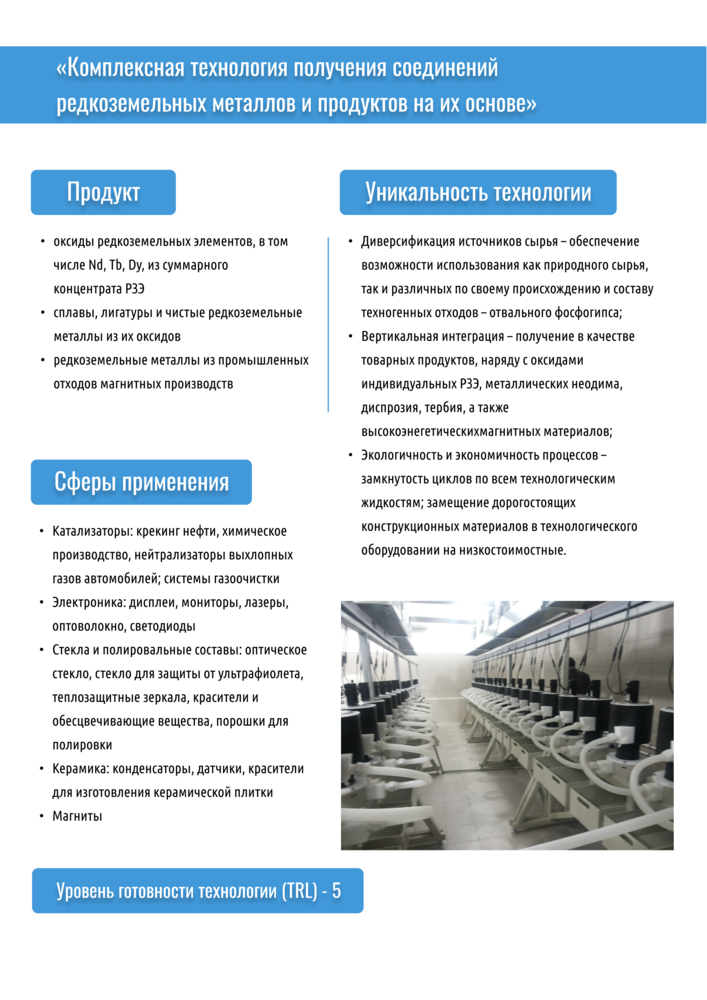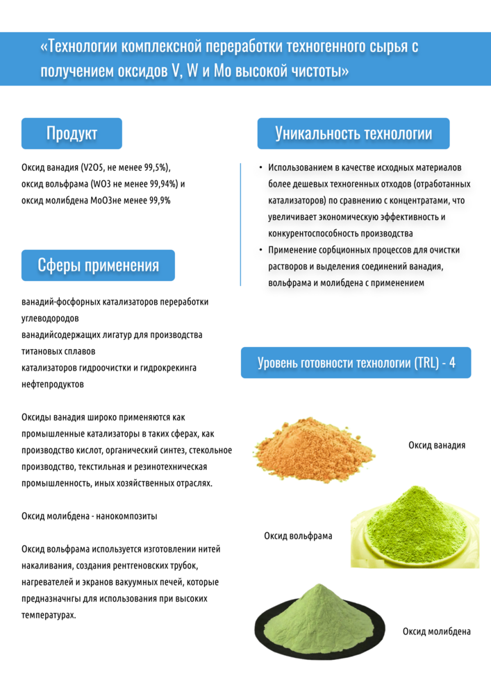 В ходе выполнения комплексного проекта разработана технология комплексной переработки техногенного сырья с получением оксидов ванадия, вольфрама и молибдена высокой чистоты, включающая в себя: