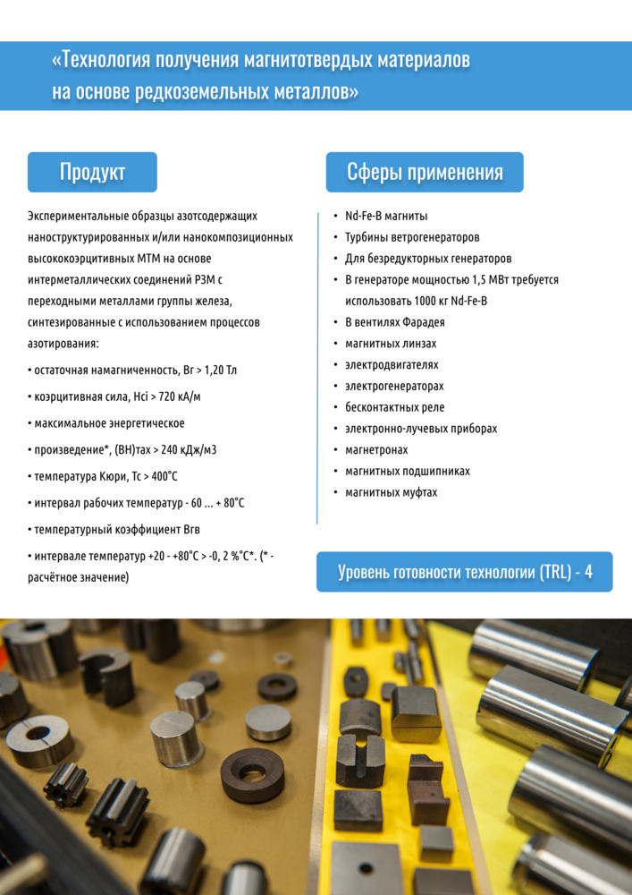 2. При реализации проекта «Разработка технологии получения магнитотвердых магнитных материалов и магнитных систем на их основе для нового поколения низкопольных магнитно-резонансных томографов» были разработаны:
