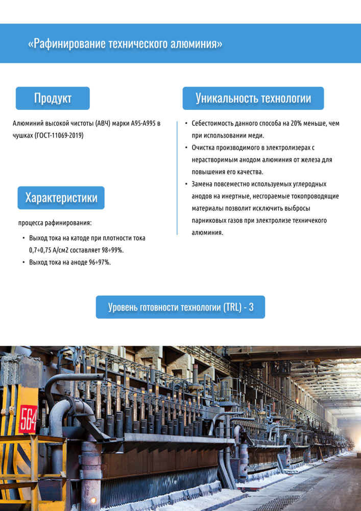 Сотрудниками кафедры цветных металлов и золота НИТУ МИСИС был разработан принципиально новый способ электрорафинирования алюминия в вертикальном электролизере. Применение такого способа исключает необходимость использования меди в анодном сплаве, что существенно сокращает себестоимость конечного продукта; за счет градиента температур в ячейке примеси концентрируются интерметаллических соединениях в анодном пространстве. При этом, чистота получаемого алюминия соответствует марке А95-А995. Необходимо отметить, что разработанный способ рафинирования алюминия может быть применен и при переработке вторичного алюминия. Способ зарегистрирован в Депозитарии ноу-хау НИТУ МИСИС (от 27 декабря 2022 г.).
